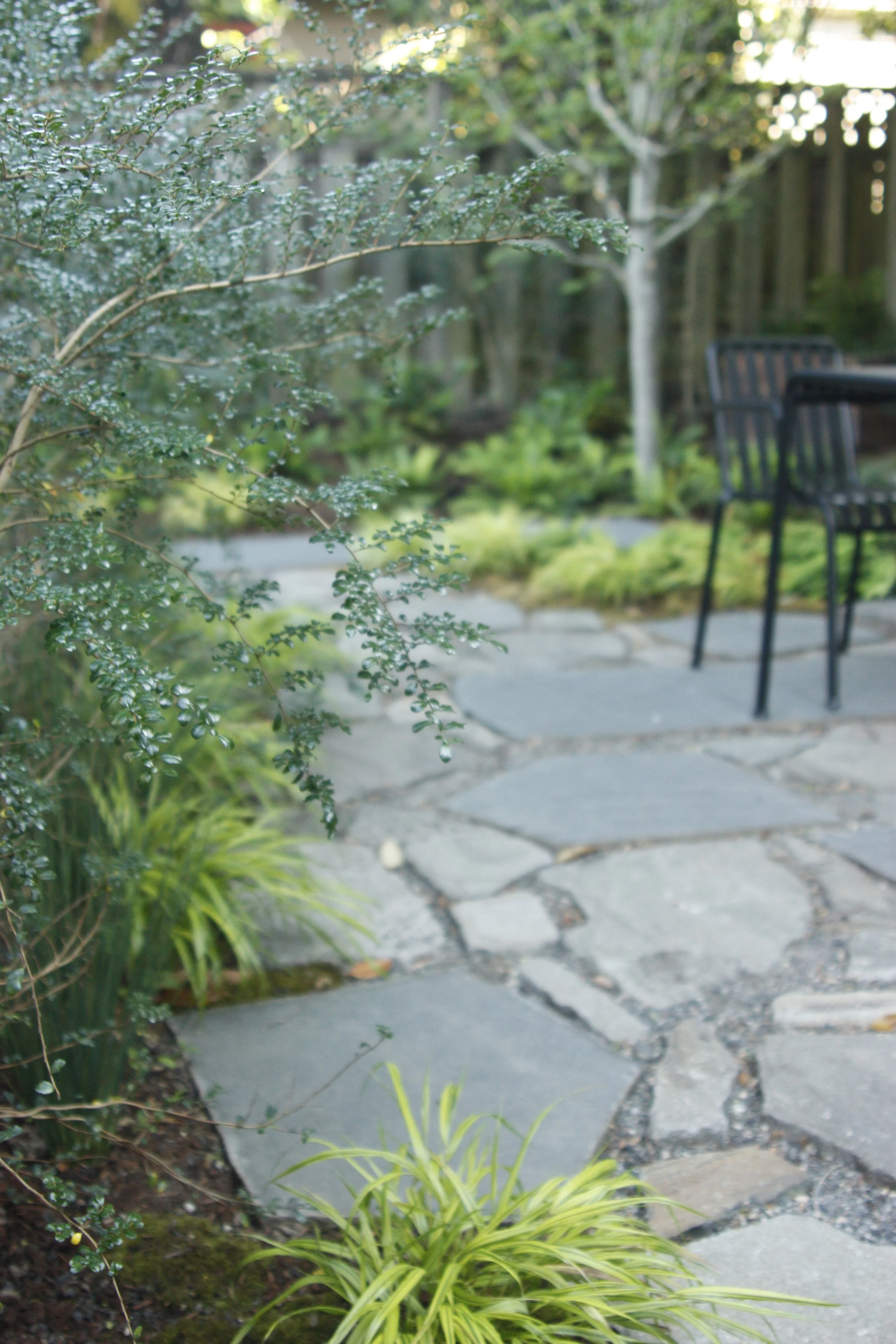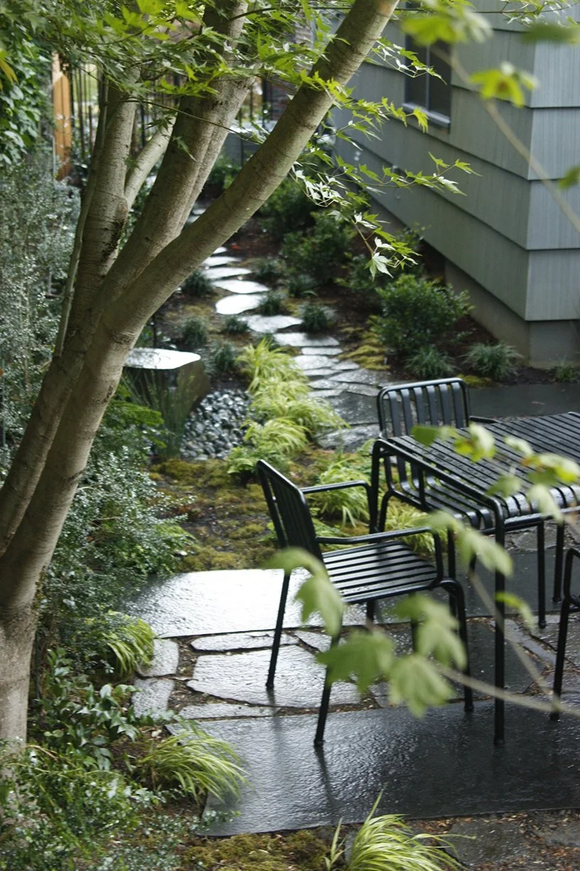 We worked closely with the landscape contractor to install a true wabi-sabi mosaic of local basalt flagstone and columnar slabs (long and sliced), construct a custom spilt black bamboo trash enclosure, and build a yakisugi (shou sugi ban) meditation bench tucked into the corner. It was such an enjoyable collaboration between client, designer and contractor, and the project truly embodies all the good energy found throughout the process. The client has the heart of a Japanese gardener and it’s been a pleasure to see how his camellia espalier is evolving, his journey into moss propagation, and to experience a shared celebration of new blooms and color spectacle coming alive every season. It brings us such joy as we think of him returning to his garden sanctuary after his daily morning runs to enjoy a tea atop his meditation bench.