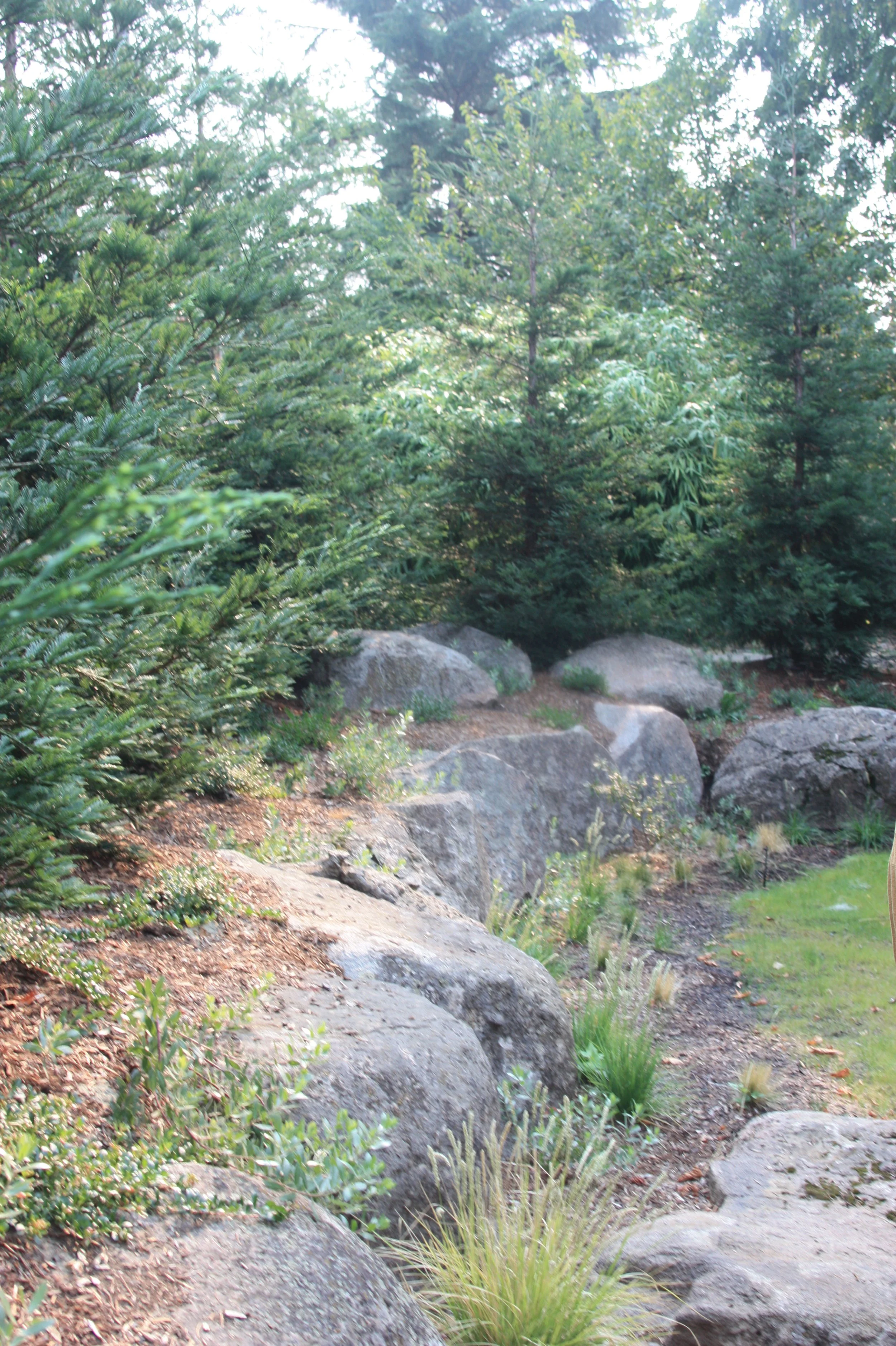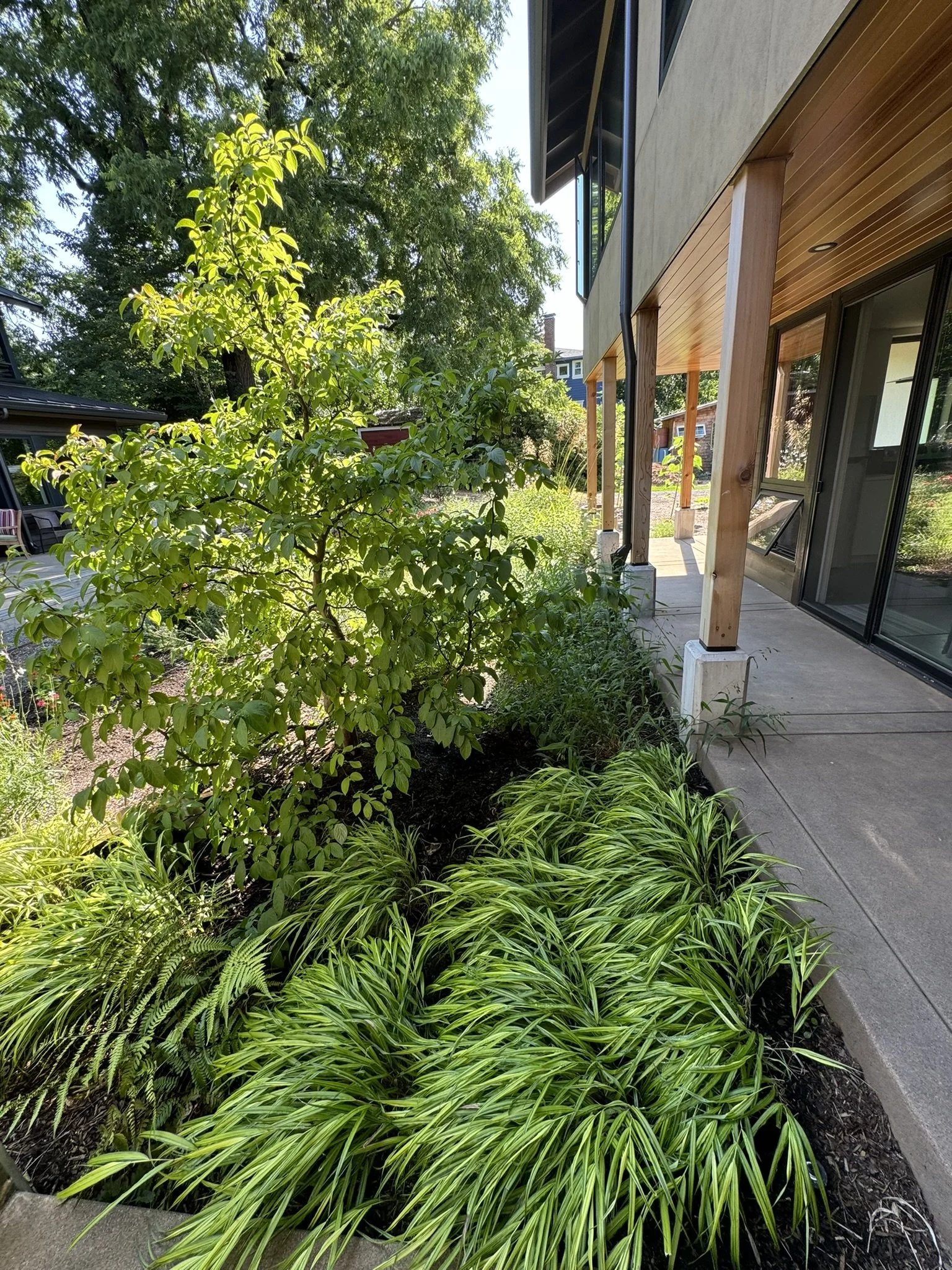 A new home and chapter in the client’s lives leaned into shaping their community compound with garden spaces that embraced the adjacent properties and outdoor gatherings while buffering the noisy Johnson Creek Blvd. at its northern edge. A layered approach to screening with sheared redwood trees and a substantial granite boulder retaining wall provided the necessary protection/separation from the street while nestling the frontside of the home into a dynamic woodland garden. As you enter the property, the sound of the gravel driveway grounds you in the space as you’re taken by the striking sculptural quality of the specimen trees complimenting the contemporary architecture.