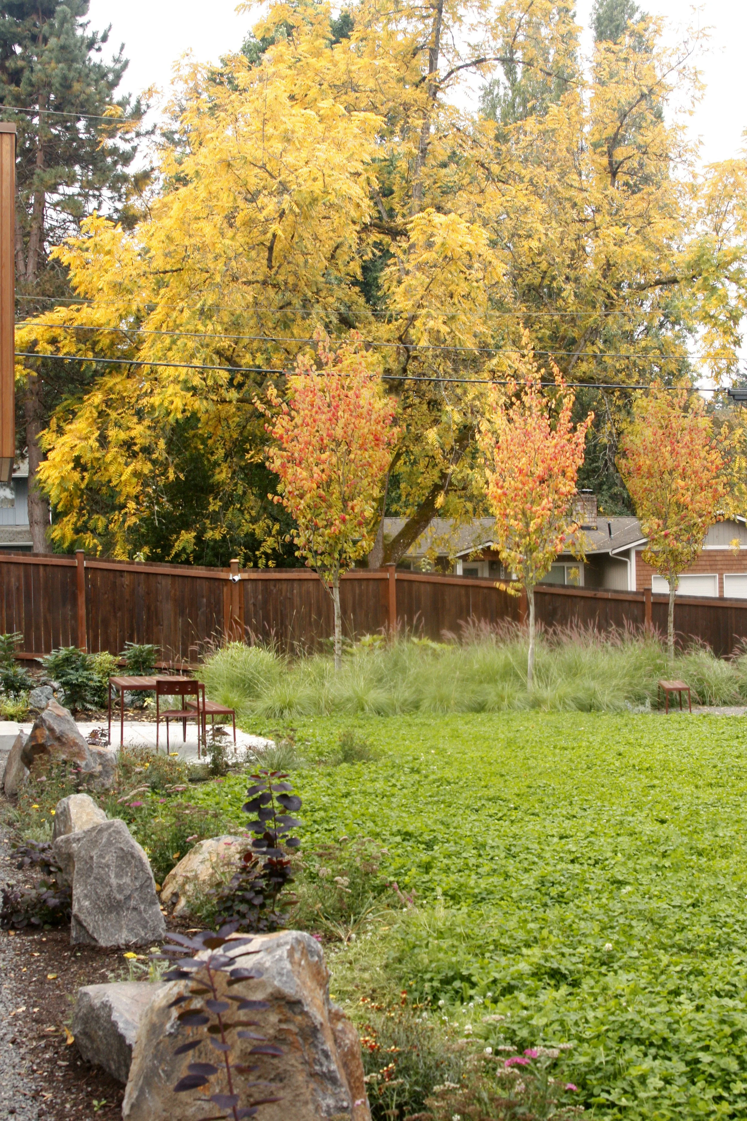 Next, we created a lush native perimeter around existing cherry trees, added lots of edibles (huckleberry, currants, etc.) and herbs. The dense fence line of the backyard serves as a counterpoint to the minimal aesthetic at the house facade.