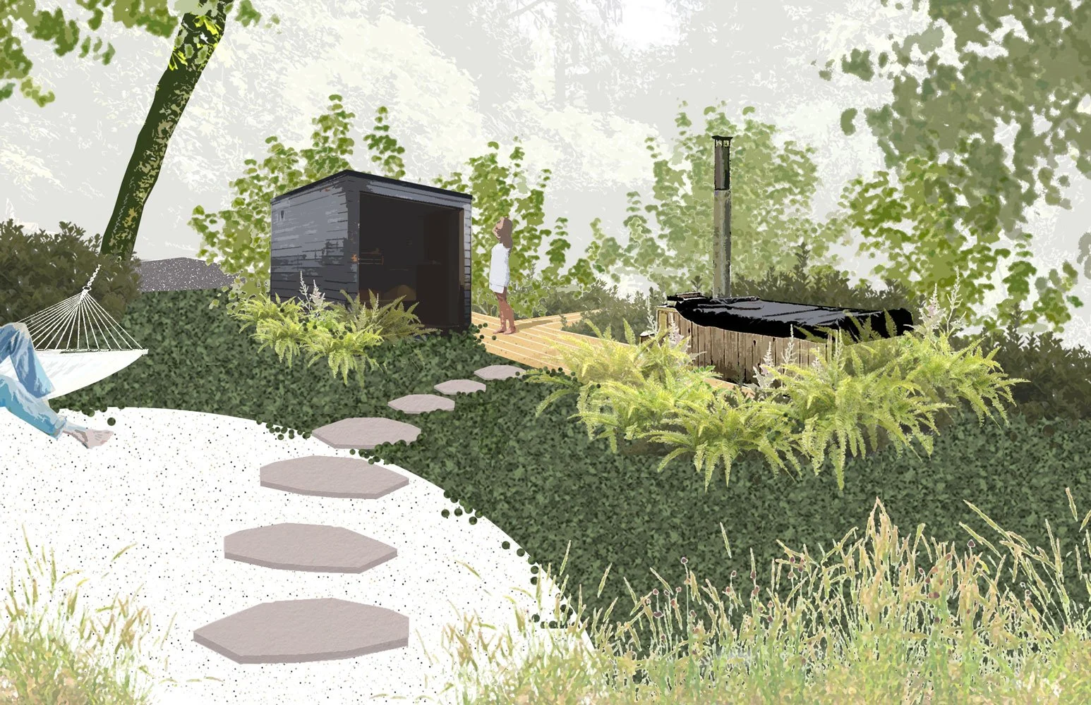 The design, which will include an enlarged gravel patio surrounded by meadow grasses, a sauna tucked into native woodland plantings and a boardwalk though the forest to an elevated camping platform, will have a soft, not too formal, wildly inviting feel.